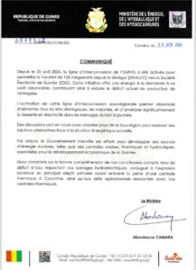 Et finalement, pour régler la crise énergétique, le gouvernement à travers le ministère de l’énergie, de l’hydraulique et des hydrocarbures a dans un communiqué publié ce mardi 30 avril 2024, annoncé l’activation de la ligne d’interconnexion de l’OMVG, permettant le transfert de 120 mégawatts depuis le Sénégal (SENELEC) vers la Société Électricité de Guinée (EDG).