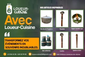 Une nouvelle micro entreprise de location d’ustensiles de cuisine dénommée LOUEUR-CUISINE voit le jour en Guinée. Elle offre à ses clients, différents articles de qualité pour une meilleure cuisson de leurs plats. Du pain bénit pour des cérémonies de baptêmes, de mariages et tout autre regroupement d’envergure.