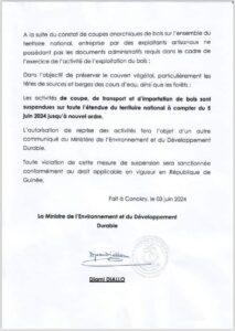 L’autre raison qui justifie la suspension de la coupe du bois, c’est pour la préservation du couvert végétal : « dans l’objectif de préserver le couvert végétal, particulièrement les tefes de sources et berges des cours d’eau, ainsi que les forêts », mentionne le communiqué signé par Madame Djamie Diallo, ministre de l’environnement et du développement durable.