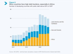 Par ailleurs, l’augmentation rapide du coût des intérêts limite les budgets des pays africains, qui ont consacré 9,2% de leurs recettes publiques au service de la dette en 2023 contre 4,4% en 2010. De plus, près de la moitié des 54 pays en développement qui ont consacré au moins 10 % des recettes publiques au paiement des intérêts de la dette en 2023 se trouvent en Afrique.