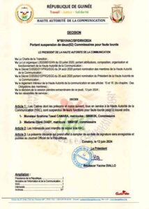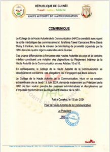 La décision a été prise ce jeudi 13 juin 2024, à l’issue d’une plénière du Collège des commissaires de l’institution en charge de la régulation des médias en Guinée.