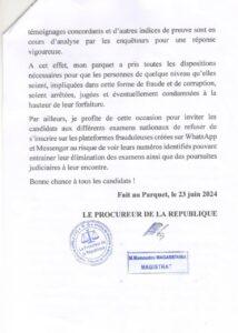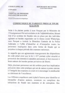 Dans un communiqué en date du 23 juin 2024, le Parquet de Kaloum a instruit la Direction centrale de la police judiciaire à l’effet d’identifier et d’interpeller toutes les personnes impliquées dans cette forme de fraude qui se perpétue à chaque période des examens nationaux.
