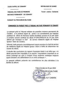 L’information a été confirmée et rendue publique ce mardi 25 juin 2024, par le Parquet près le tribunal militaire permanent de Conakry à travers un communiqué.