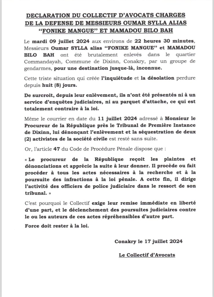 Dans une déclaration publiée dans la soirée de ce mercredi, le collectif des avocats de la défense des leaders du FNDC dissout, Foniké Mengué et Billo Bah, exige leur libération près de 10 jours après leur enlèvement par des hommes en uniforme encagoulés et détenus dans un lieu tenu secret jusque-là.