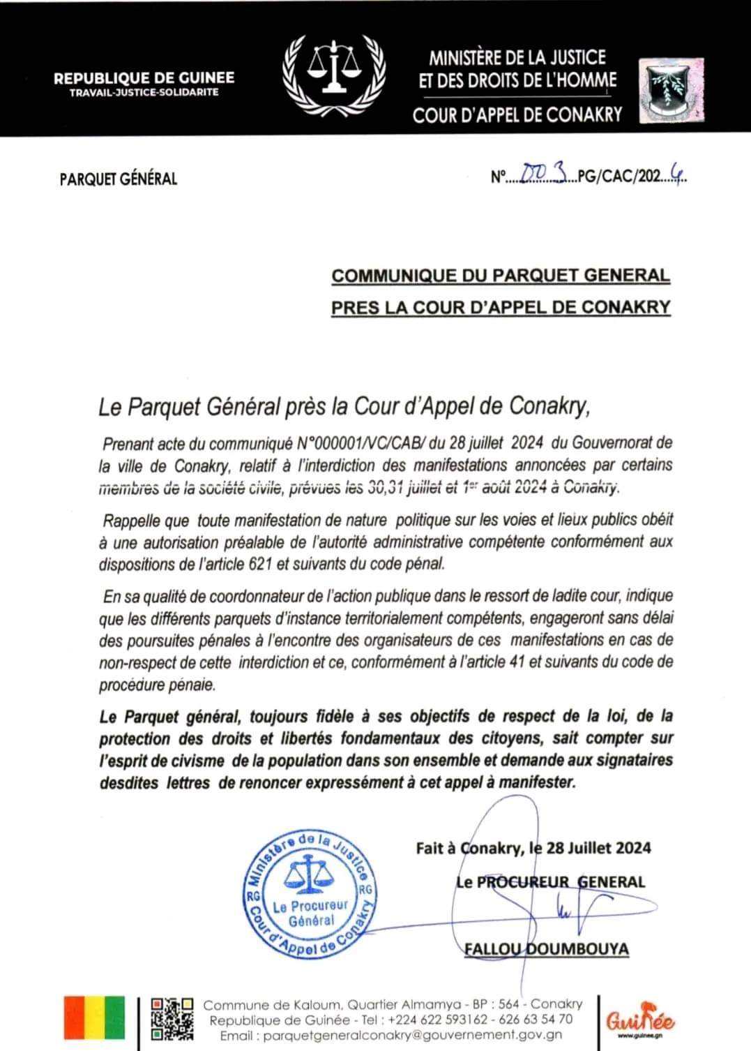 Comme il fallait s’y attendre, le Procureur général près la Cour d’Appel de Conakry, a dans un communiqué publié ce dimanche 28 juillet 2024, inviter les organisateurs à renoncer à leur appel à manifester, rappelant que les manifestations sont interdites par les autorités jusqu’à nouvel ordre.