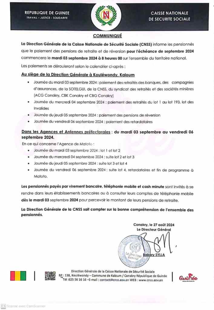 Tags: CNSS: La Direction Générale dévoile le calendrier de paiement des pensions de retraite de l'échéance de septembre 2024
