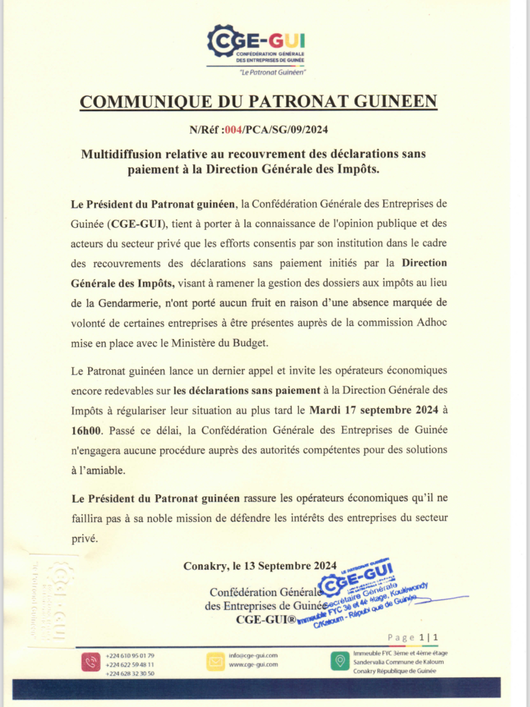 Par conséquent, le Patronat guinéen lance un dernier appel et invite les opérateurs économiques encore redevables sur les déclarations sans paiement à la Direction Générale des Impôts à régulariser leur situation au plus tard le Mardi 17 septembre 2024 à 16h00. Passé ce délai, la Confédération Générale des Entreprises de Guinée n’engagera aucune procédure auprès des autorités compétentes pour des solutions à l’amiable.