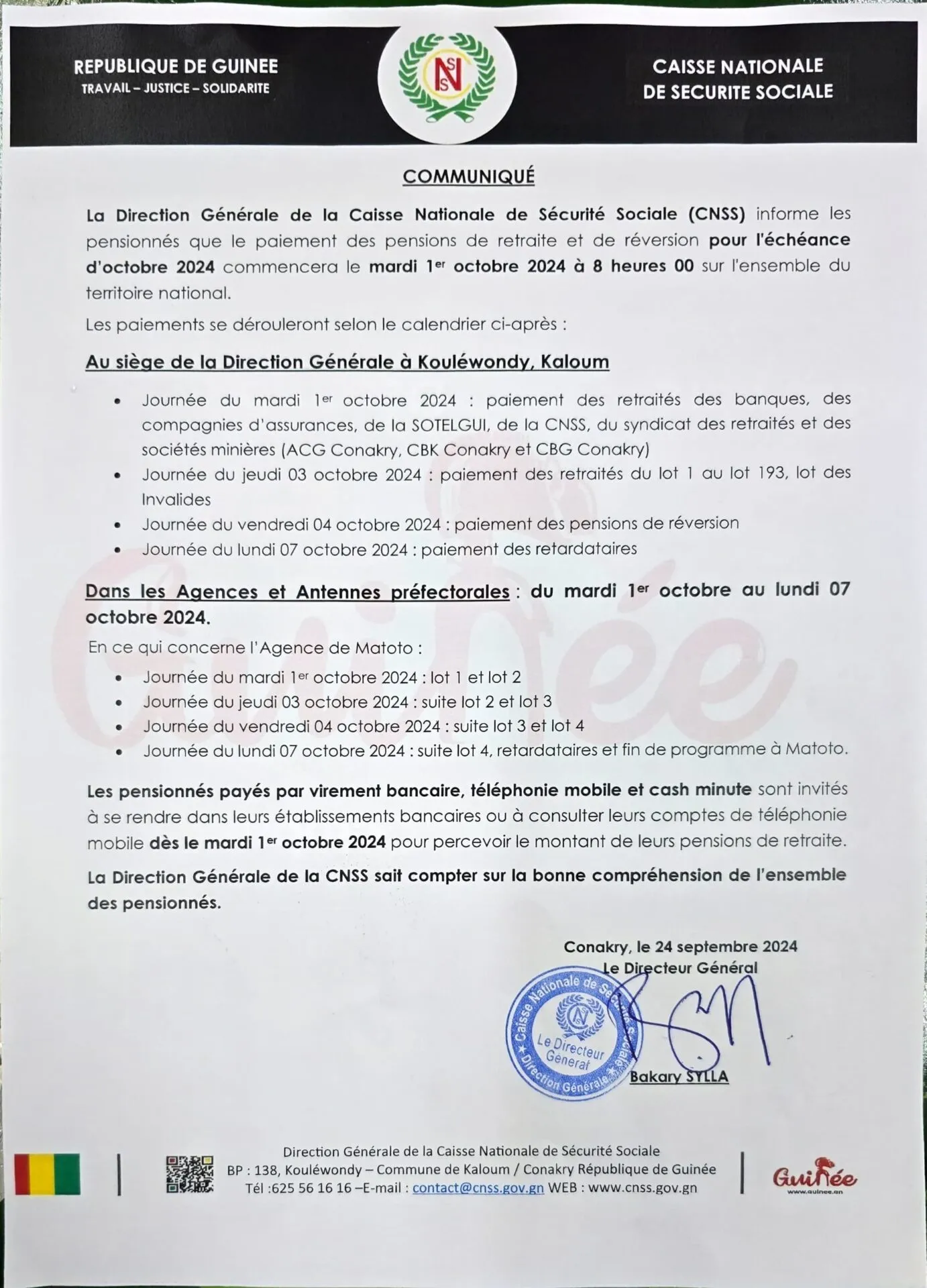 La Direction Générale de la Caisse Nationale de Sécurité Sociale (CNSS), informe les pensionnés que le paiement des pensions de retraite et de réversion pour l’échéance d’octobre 2024 commencera le mardi 1er octobre 2024 à 8 heures 00 sur l’ensemble du territoire national. Les paiements se dérouleront selon le calendrier établit dans le présent communiqué.