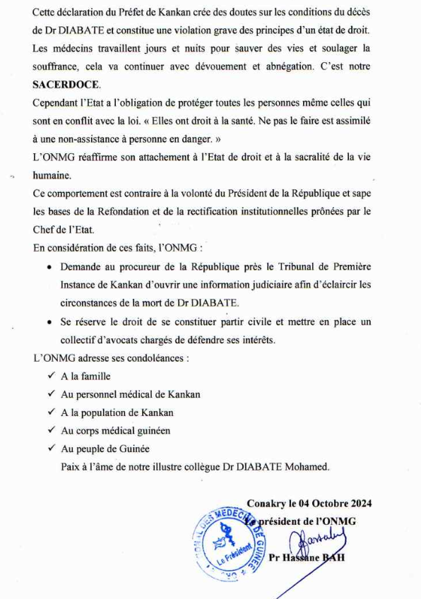 En conséquence, l’ordre des médecins demande l’ouverture d’une information judiciaire : « l’ONMG demande au procureur de la République près le Tribunal de Première Instance de Kankan d’ouvrir une information judiciaire afin d’éclaircir les circonstances de la mort de Dr DIABATE. Et, se réserve le droit de se constituer partir civile et mettre en place un collectif d ‘avocats chargés de défendre ses intérêts ».