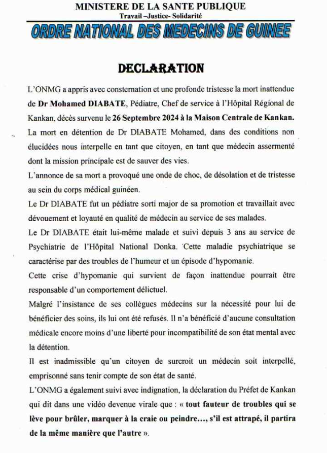 Dans une déclaration publiée ce vendredi 04 octobre 2024, l’Ordre Nationale des Médecins des Guinée (ONMG), se dit profondément attristé et consterné par la mort tragique du Dr Mohamed Diabaté médecin pédiatre à l’hôpital régional de Kankan : « la mort inattendue de Dr Mohamed DIABATE, Pédiatre, Chef de service à l’Hôpital Régional de Kankan, décès survenu le 26 Septembre 2024 à la Maison Centrale de Kankan. La mort en détention de Dr DIABATE Mohamed, dans des conditions non élucidées nous interpelle en tant que citoyen, en tant que médecin assermenté dont la mission principale est de sauver des vies », mentionne la déclaration.