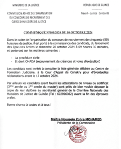 Dans un communiqué, la commission adhoc de l’organisation du concours de recrutement des clercs d’huissiers de justice, porte à la connaissance des candidats