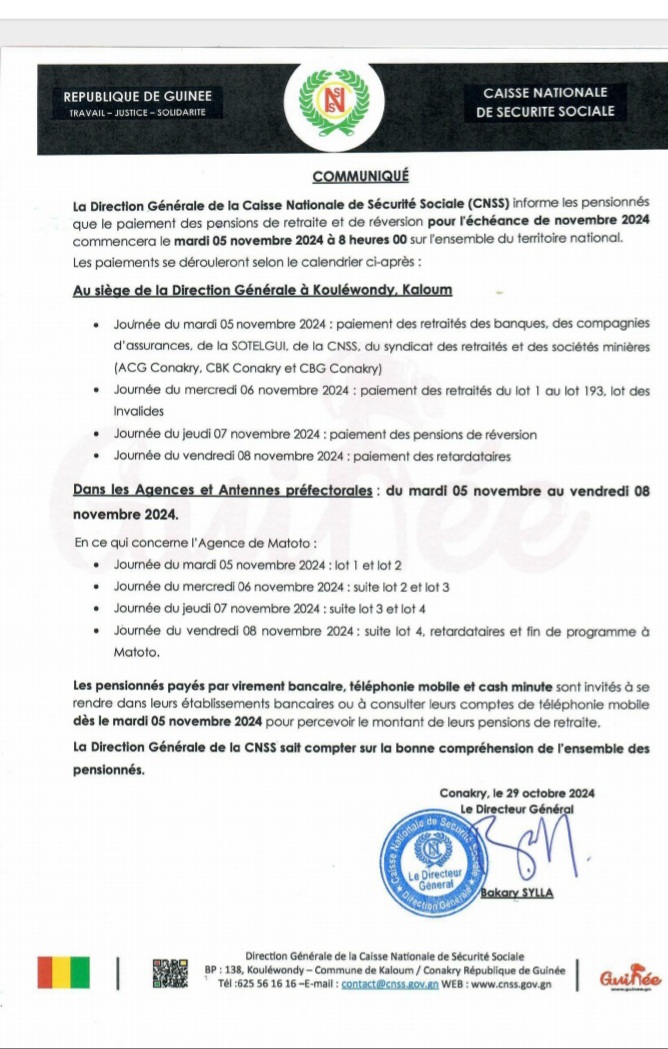 Dans un communiqué publié ce mardi 29 octobre 2024, la Direction Générale de la Caisse Nationale de Sécurité Sociale ( CNSS), informe les pensionnés que le paiement des pensions de retraite et de réversion pour l’échéance de novembre 2024, commencera le mardi 05 novembre 2024 à 8h sur l’ensemble du territoire national.