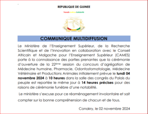 Le Ministère de l’Enseignement Supérieur, de la Recherche Scientifique et de l’Innovation en collaboration avec le Conseil Africain et Malgache pour l’Enseignement Supérieur (CAMES) porte à la connaissance des parties prenantes que la cérémonie d’ouverture de la 22ème session du concours d’agrégation de Médecine humaine, Pharmacie, Odontostomatologie, Médecine Vétérinaire et Productions Animales initialement prévue le lundi 04 novembre 2024 à 10 heures dans la salle des congrès du Palais du peuple est reportée le même jour à 14 heures précises pour des raisons de cérémonie funèbre d’une notabilité. Le ministère s’excuse pour ce réaménagement involontaire et sait compter sur la bonne compréhension de chacun et de tous.