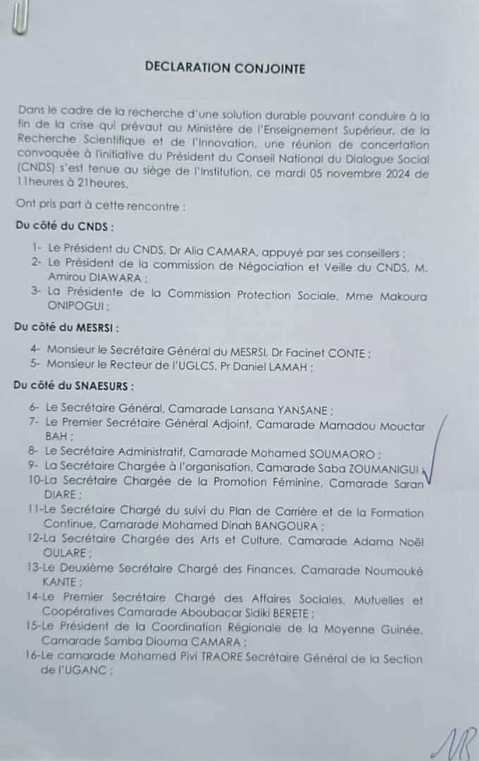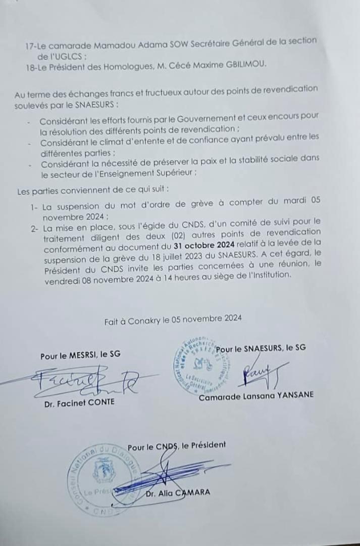 Cette décision fait suite à des “avancées significatives” dans les négociations avec le gouvernemen sous l’égide du Conseil National de Dialogue Social (CNDS) dirigé par Dr Alia Camara.