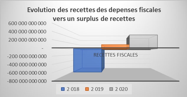Nous étions passés d’une dépense fiscale de près de 700 milliards GNF en 2018 à environ 412 milliards GNF de surplus de recettes en 2020. Très concrètement à partir de 2019 l’imposition a été celui du droit commun, donc tous les impôts ont été correctement recouvré et il y’avait eu un surplus. L’axe vertical représente le point d’équilibre donc le droit commun, tout ce qui se retrouve au-dessus de l’axe représente un surplus.