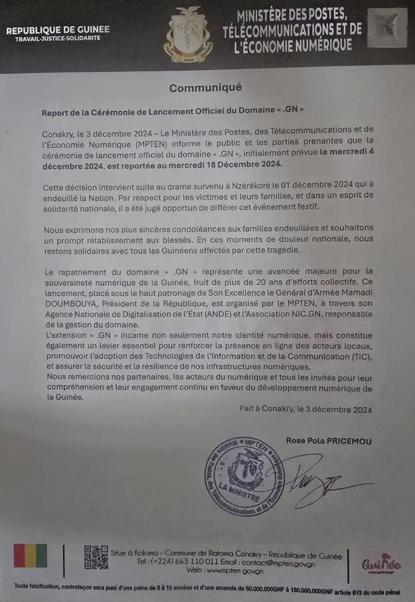 Dans un communiqué publié ce mardi 3 décembre 2024, le ministère des postes, des télécommunications et de l’économie numérique annonce le report de la cérémonie de lancement officiel du domaine « .GN », initialement prévu pour ce mercredi 4 décembre 2024, au mercredi 18 décembre 2024.