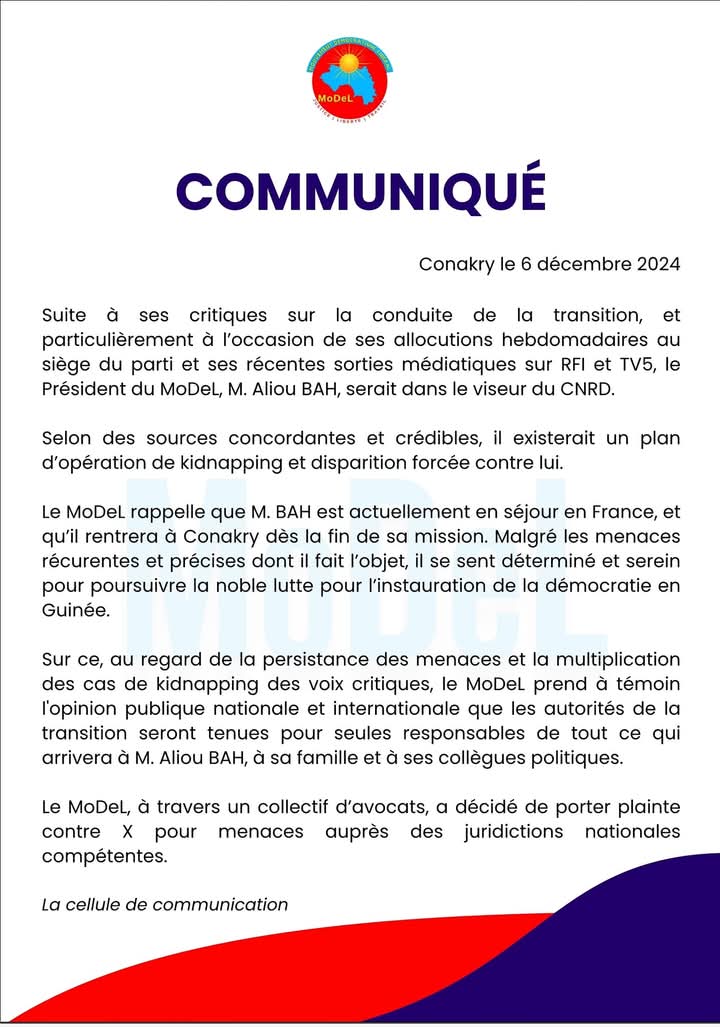 En effet, dans un communiqué publié ce vendredi 6 décembre 2024, le MoDeL alerte sur l’existence d’un plan d’opération visant l’enlèvement de son leader Aliou Bah.