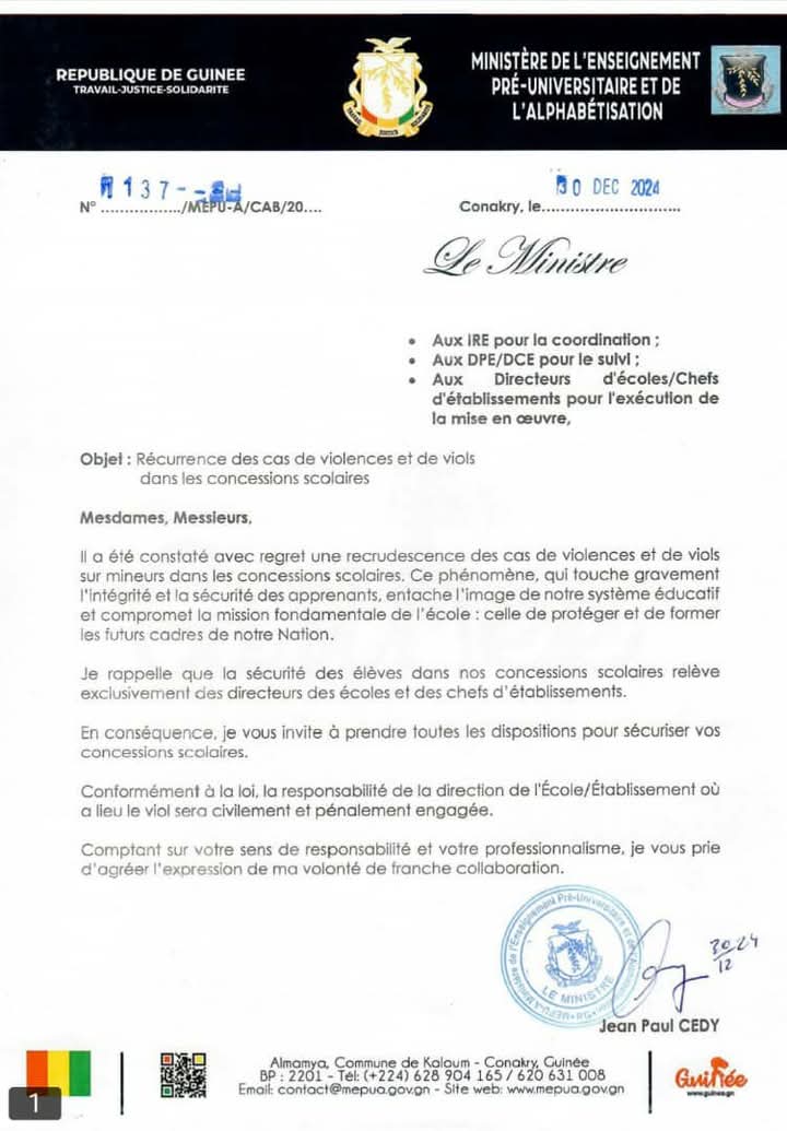 Face à l’ampleur des phénomènes de viols et violences, qui menacent gravement l’intégrité et la sécurité des apprenants, entache l’image de notre système éducatif, le ministère de l’éducation nationale et de l’alphabétisation a dans un communiqué invité les acteurs et décideurs du système éducatif guinéen à prendre toutes les mesures pour sécuriser leurs écoles.