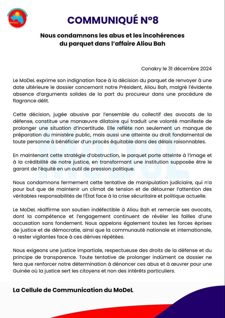 Mais dans un communiqué qu’il vient juste de publier, le MoDeL a exprimé son indignation face à la décision du parquet de renvoyer à une date ultérieure le dossier concernant Aliou Bah, malgré l’évidente absence d’arguments solides de la part du procureur dans une procédure de flagrance délit. Plus loin, le mouvement estime que cette décision constitue une manœuvre dilatoire qui traduit une volonté manifeste de prolonger une situation d’incertitude.