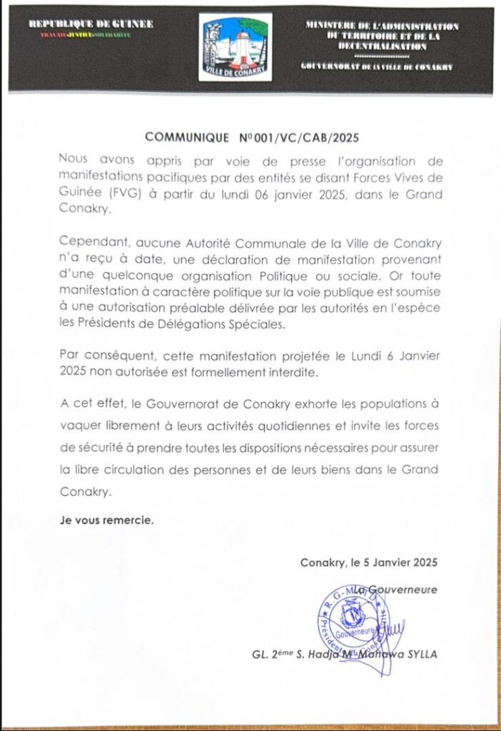 Dans un communiqué publié dans la soirée de ce dimanche 5 janvier 2025, Madame la Gouverneure de la ville de Conakry a réitéré l’interdiction jusqu’à nouvel ordre, des manifestations sur les voies publiques.