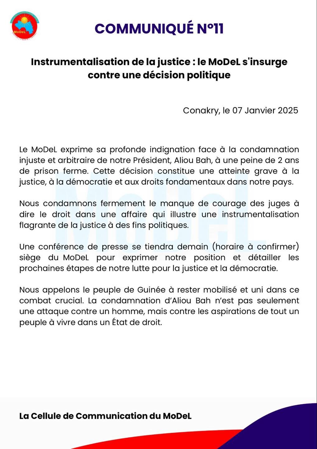 Le Mouvement Démocratique Libéral (MoDeL), n’a pas tardé de réagir après la condamnation par le TPI de Kaloum, de son leader Aliou Bah, à 2 ans de prison ferme pour offense et diffamation à l’encontre du Chef de l’État par le biais d’un système informatique.