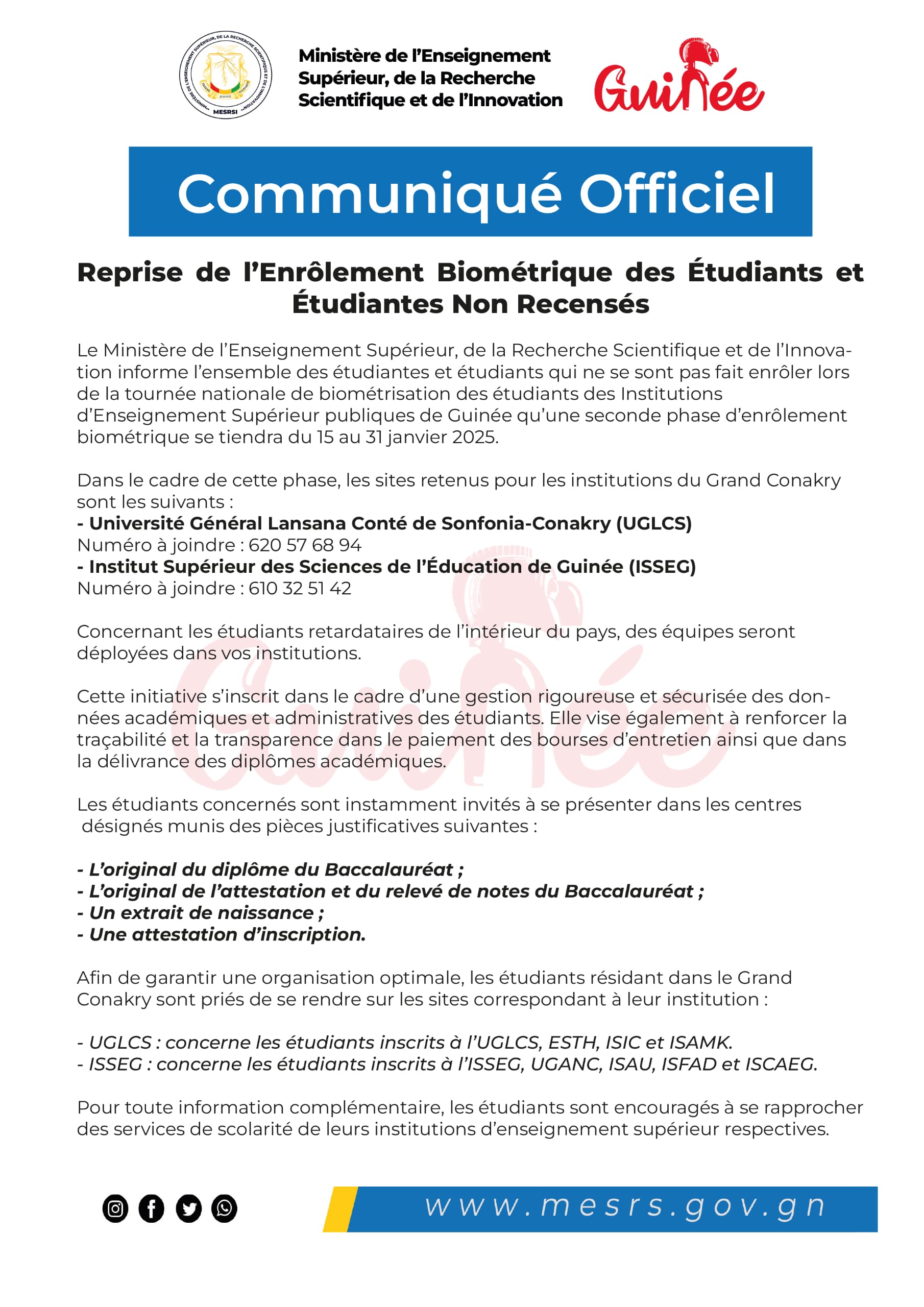 Le Ministère de l’Enseignement Supérieur, de la Recherche Scientifique et de l’Innovation informe l’ensemble des étudiantes et étudiants qui ne se sont pas fait enrôler lors de la tournée nationale de biométrisation des étudiants des Institutions d’Enseignement Supérieur publiques de Guinée qu’une seconde phase d’enrôlement biométrique se tiendra du 15 au 31 janvier 2025.