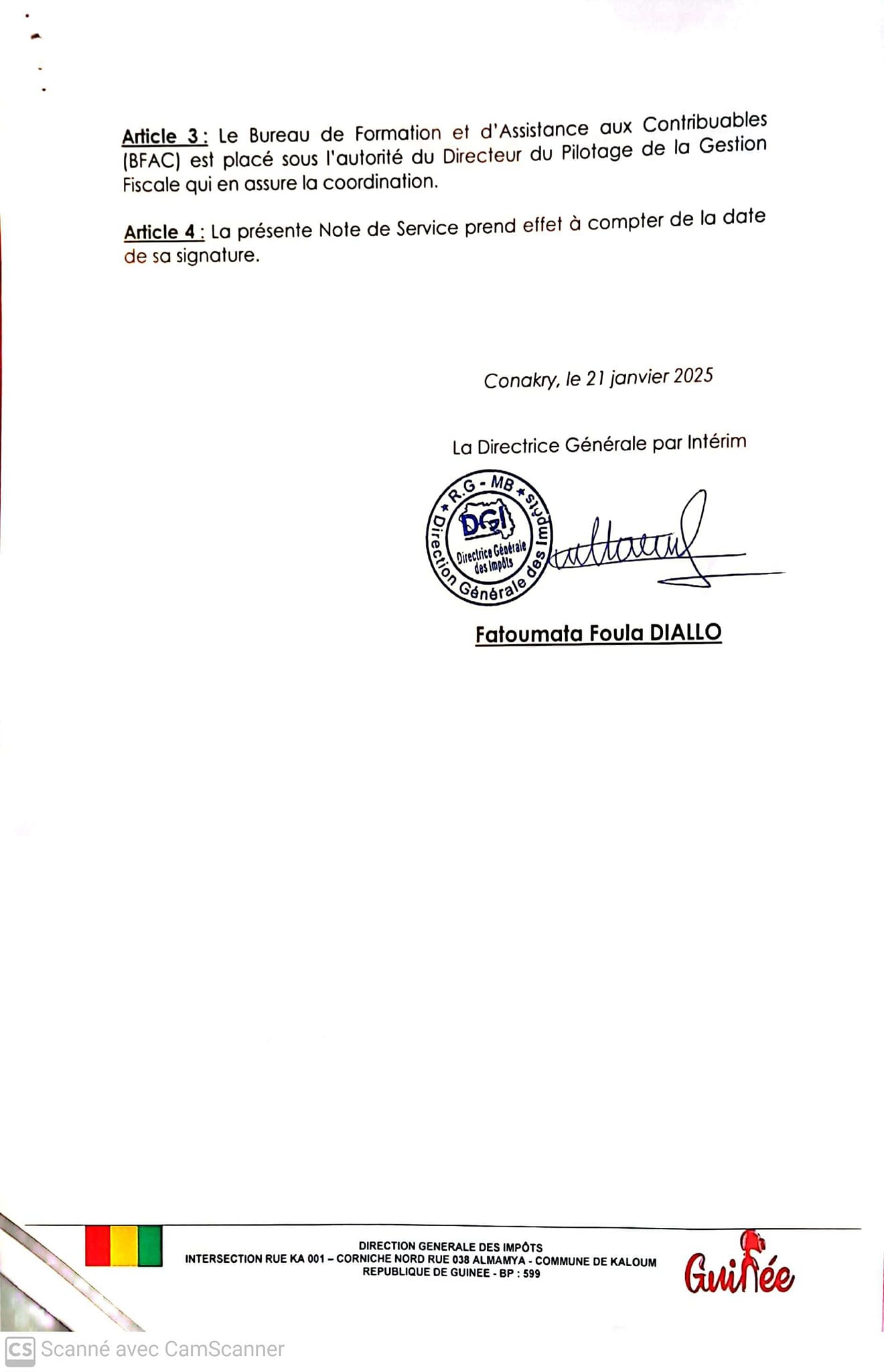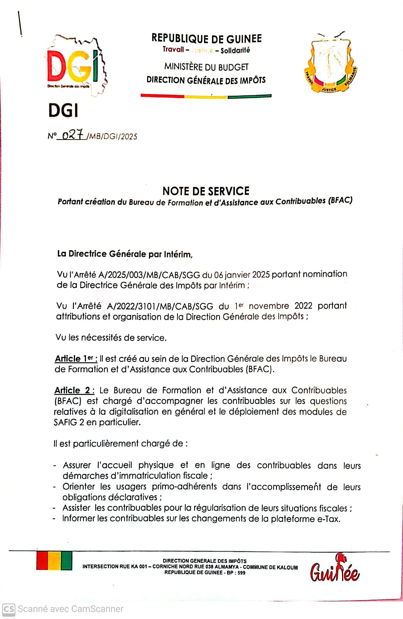 Selon la note de service, le rôle de ce bureau est d’assurer l’accueil physique et en ligne des contribuables dans leurs démarches d’immatriculation fiscale, orienter les usagers primo adhérents dans l’accomplissement de leurs obligations fiscale etc…