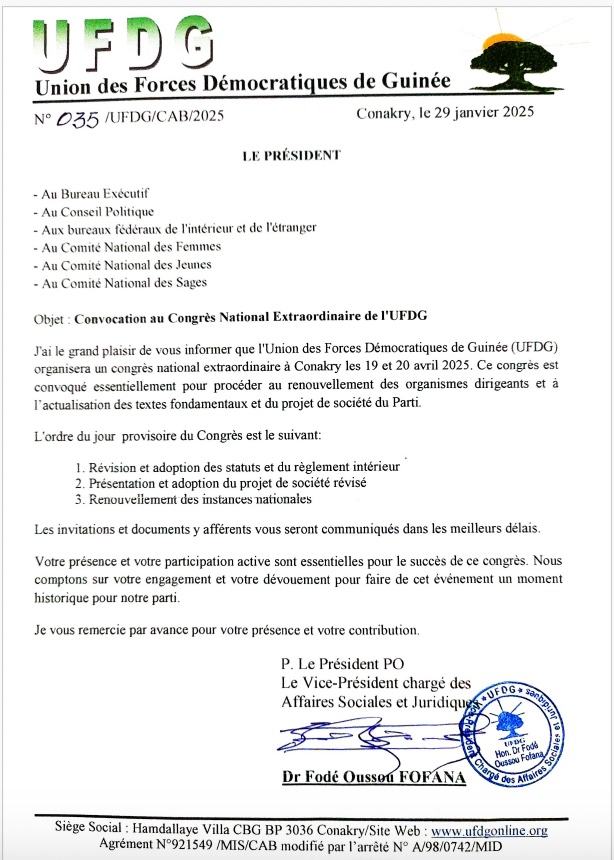 Comme attendu et réitérer ces derniers temps par les hauts responsables de l’UFDG, le parti va organiser son congrès national extraordinaire à Conakry, les 19 et 20 avril 2025. L’annonce a été faite ce jeudi 30 janvier 2025, via un communiqué signé par Dr Fodé Oussou Fofana, Vice-président chargé des Affaires juridiques et sociales.