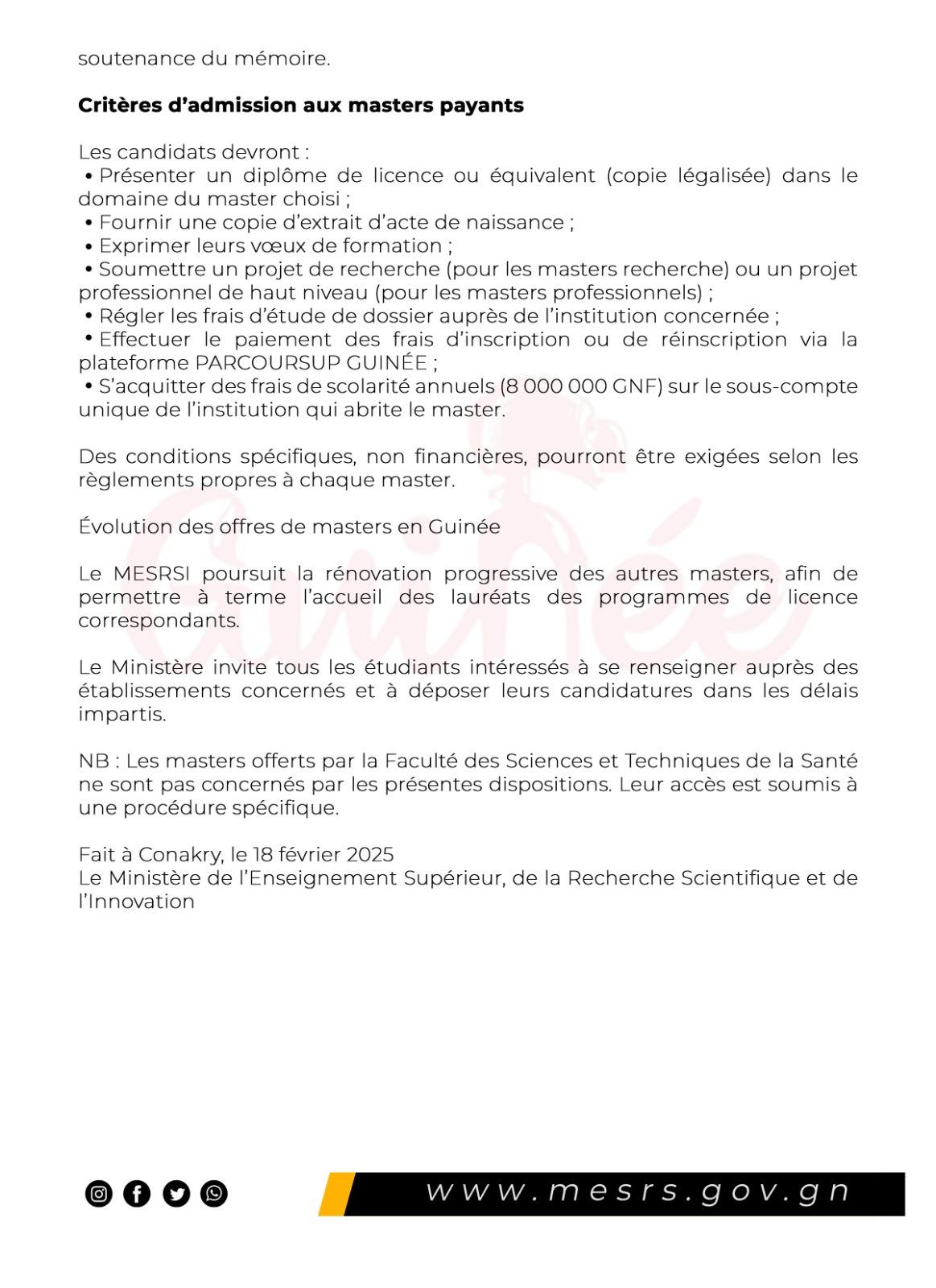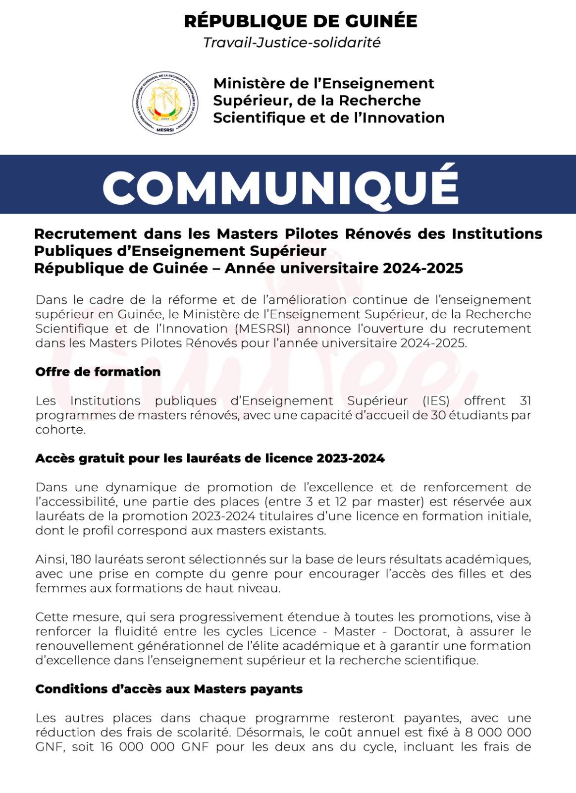 Dans le cadre de la réforme et de l’amélioration continue de l’enseignement supérieur en Guinée, le Ministère de l’Enseignement Supérieur, de la Recherche Scientifique et de l’Innovation (MESRSI) annonce l’ouverture du recrutement dans les Masters Pilotes Rénovés pour l’année universitaire 2024-2025.