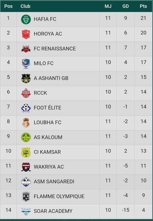 Au classement, ce nul permet au Horoya AC se rapproche du leader Hafia FC, avec 20 points contre 21 pour le Hafia FC, solide leader. Pour les autres matchs au compte de la 11é journée, le FC Renaissance a lourdement chuté face au Wakriya (4-0).