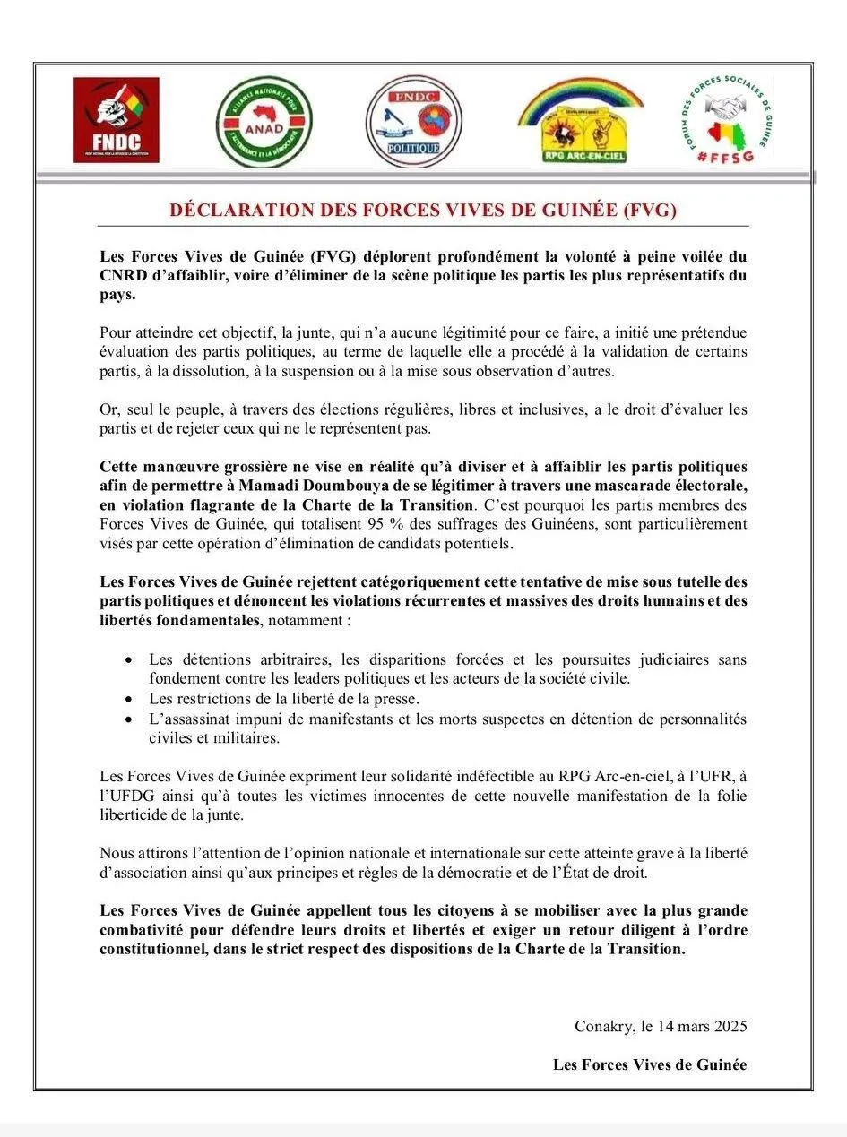 Dans une déclaration publiée ce samedi 15 mars 2025, les Forces Vives de Guinée, rejettent les résultats d’évaluation des partis politiques mené par le ministère de l’administration du territoire et de la décentralisation.