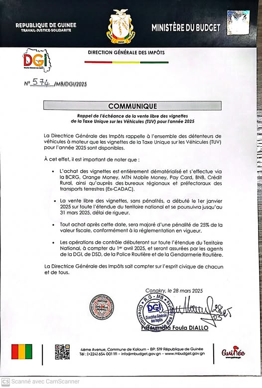 Dans un communiqué publié ce vendredi 28 mars 2025, la Direction Générale des Imports (DGI), dirigée par Fatoumata Foula Diallo, rappelle aux propriétaires de véhicules à moteur que la vente des vignettes de la Taxe Unique sur les Véhicules (TUV) pour l’année 2025, a débuté depuis le 1er janvier 2025.