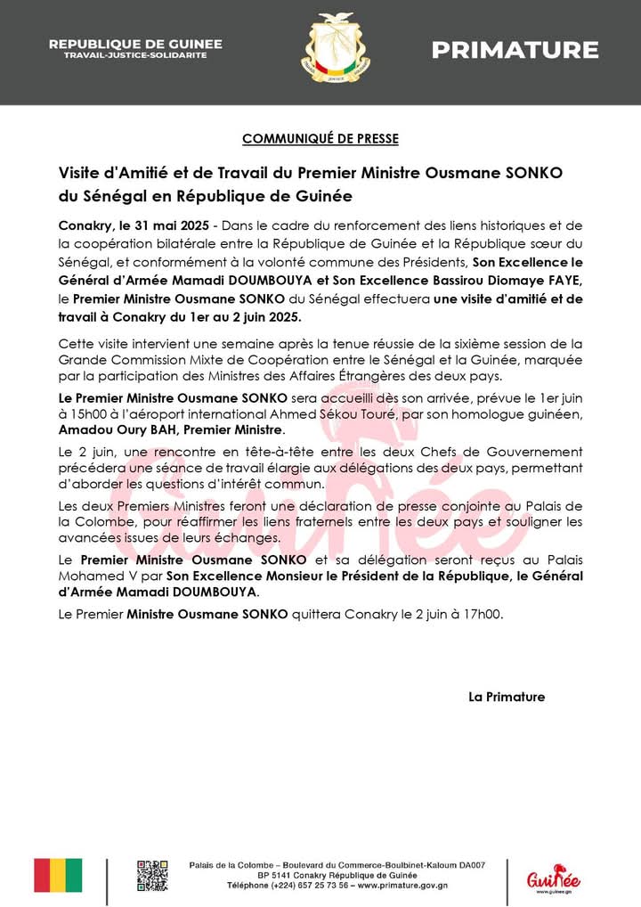 Le Premier Ministre sénégalais, Ousmane Sonko, est attendu à Conakry les 1er et 2 juin 2025 pour une visite d’amitié et de travail. C’est une annonce faite via un communiqué dans la soirée de ce samedi par la Présidence de la République. Cette démarche s’inscrit dans le cadre du renforcement des liens historiques et de la coopération bilatérale entre la République de Guinée et la République du Sénégal, une volonté clairement affirmée par les Présidents Mamadi Doumbouya et Bassirou Diomaye Faye.