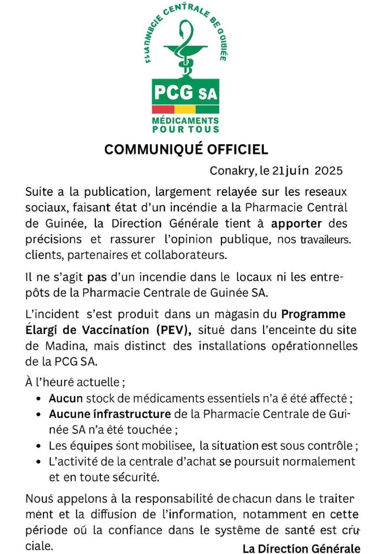 Contrairement aux premières informations relayées, ce n’est pas la Pharmacie Centrale de Guinée qui a été directement touchée par l’incendie, mais un entrepôt de stockage du Programme élargi de vaccination (PEV), situé dans l’enceinte de la cour de la pharmacie.