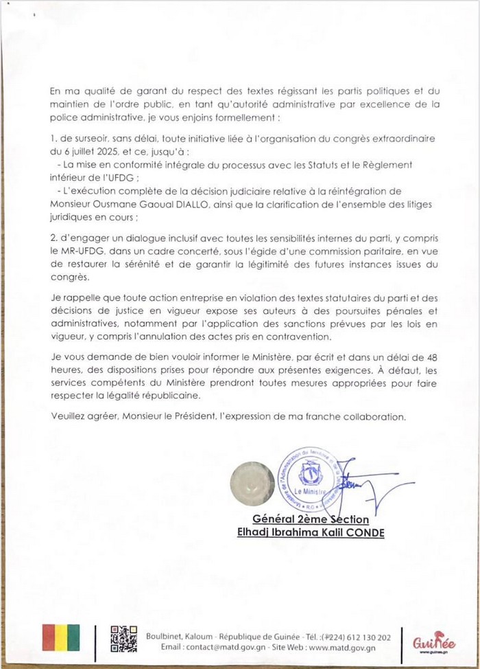 Le ministère dirigé par Ibrahima Kalil Condé, motive cette décision par des contentieux judiciaires internes opposant certains membres du parti. D’après les éléments fournis au ministre par le Mouvement « Les Formateurs » de l’UFDG, de nombreuses infractions graves aux dispositions statutaires et réglementaires en vigueur auraient été constatées. »