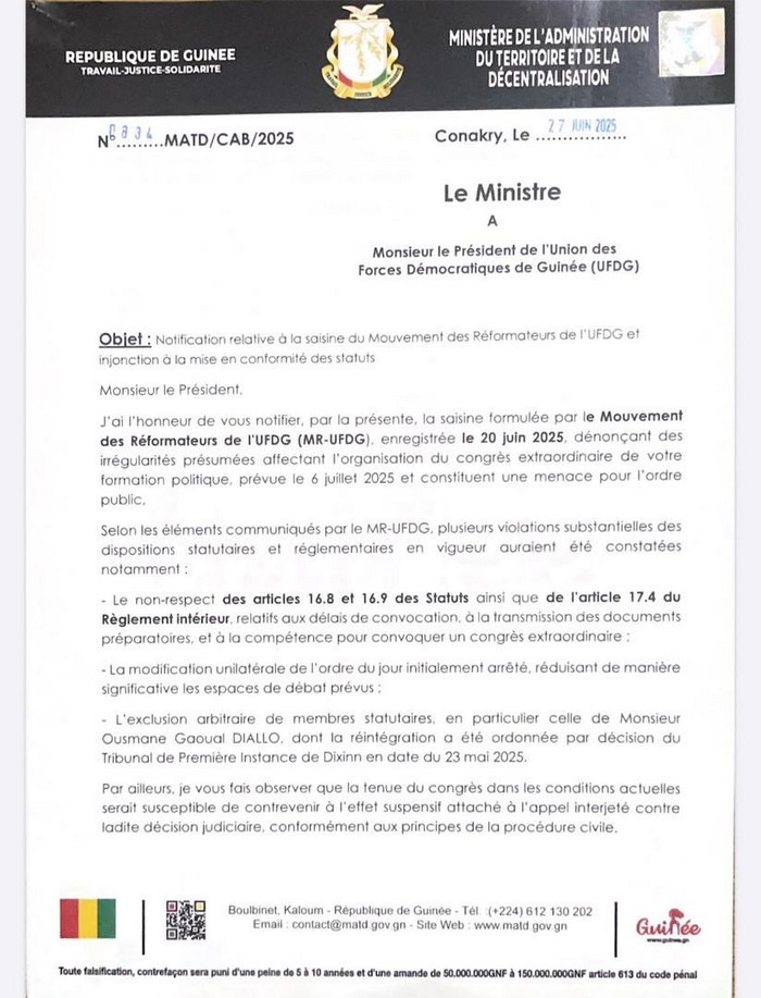 Ce vendredi 27 juin 2025, le ministère de l’administration du territoire et de la décentralisation (MATD) a, dans un communique, demandé catégoriquement à l’UFDG dirigée par Cellou Dalein Diallo de surseoir à son congrès initialement prévu pour le 6 juillet 2025.