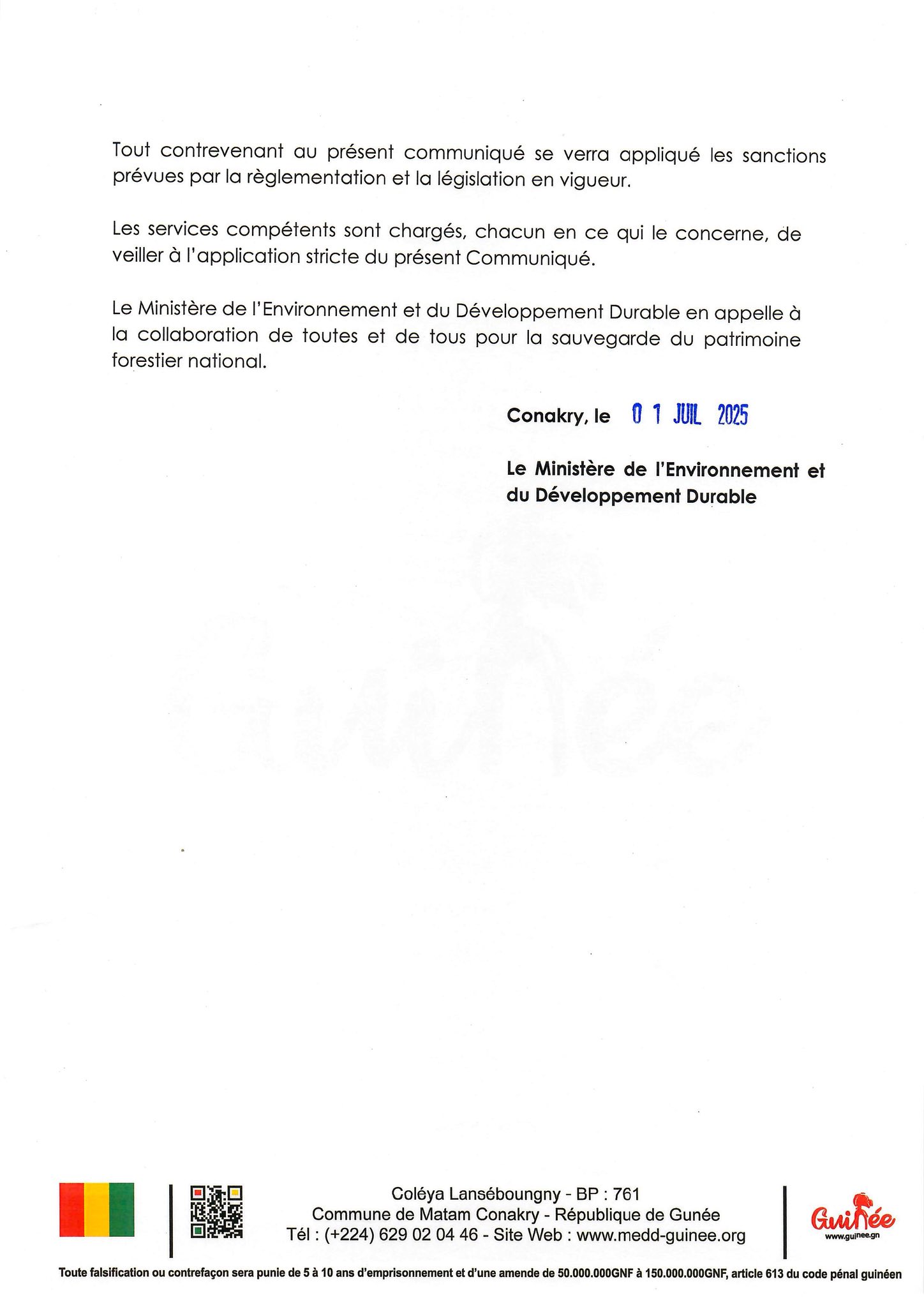 Le ministère de l’Environnement et du Développement Durable a annoncé, à travers un communiqué officiel publié ce mardi 1er juillet 2025, la suspension de toutes les activités de coupe et de transport de bois sur l’ensemble du territoire national, à compter du 7 juillet jusqu’au 30 septembre 2025.