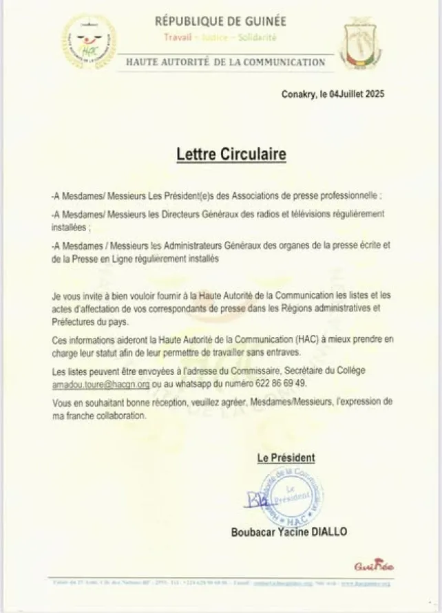 La Haute Autorité de la Communication (HAC) a adressé, le 4 juillet 2025, une circulaire aux médias agréés en Guinée, leur demandant de transmettre la liste et les actes d’affectation de leurs correspondants en régions et préfectures. Selon son président, Boubacar Yacine Diallo, cette démarche vise à mieux encadrer ces journalistes et à renforcer leur protection dans l’exercice de leur métier.