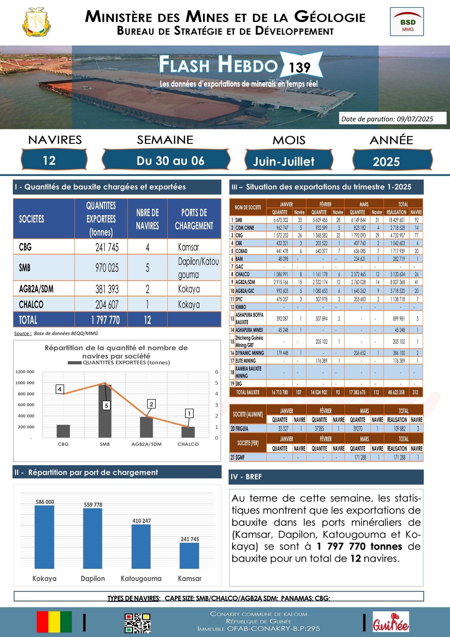 La Guinée continue d’affirmer sa position dominante sur le marché mondial de la bauxite avec des volumes d’exportation particulièrement soutenus à la fin du mois de juin. D’après les données du Flash Hebdo n°133, portant sur la semaine du 19 au 25 juin 2025, les sociétés minières opérant dans le pays ont exporté un total de 4 194 134 tonnes de bauxite à travers 26 navires.