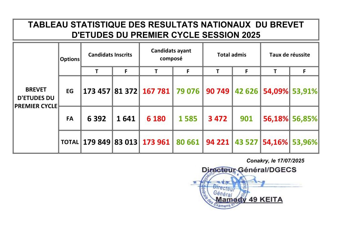 Le Ministère de l’Enseignement Pré-Universitaire et de l’Alphabétisation (MEPU-A) a dévoilé les résultats nationaux du Brevet d’Études du Premier Cycle (BEPC), session 2025. Cette année, le taux de réussite atteint 54,16 % à l’échelle nationale.