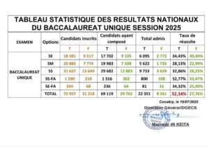 Les résultats du baccalauréat session 2025 viennent d’être dévoilés. Le taux de réussite national s’établit cette année à 32,34 %, marquant une progression notable par rapport à l’année précédente, où seulement 24,64 % des candidats avaient réussi l’examen.