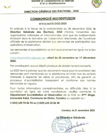 Toutes les organisations et personnes intéressées doivent désormais soumettre leur demande exclusivement en ligne via l’adresse : www.observation.dge.gov.gn, et ce, du 22 novembre au 17 décembre 2025.