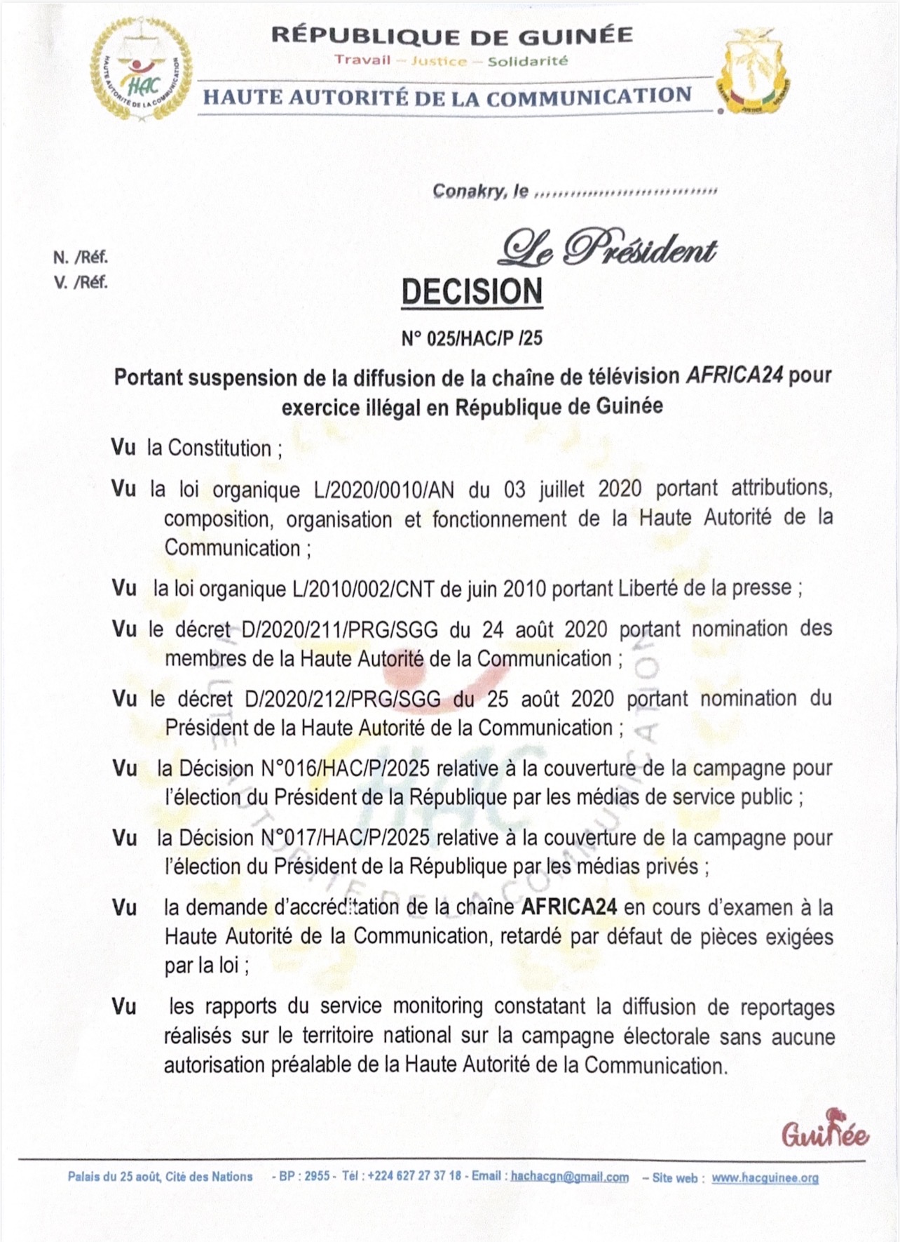 La Haute Autorité de la Communication (HAC), a décidé de suspendre la diffusion de la chaîne de télévision Africa 24 en Guinée.