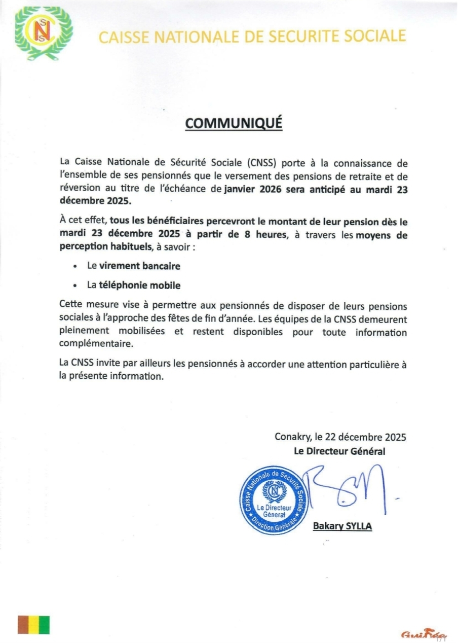 La Caisse Nationale de Sécurité Sociale (CNSS) informe l’ensemble de ses pensionnés que le versement des pensions de retraite et de réversion correspondant à l’échéance de janvier 2026 sera effectué de manière anticipée.