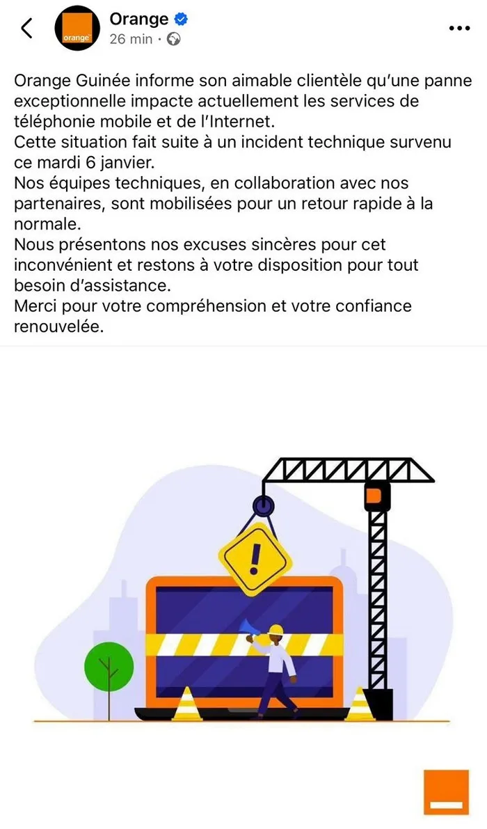 Les abonnés de l’opérateur de téléphonie mobile Orange Guinée ont été confrontés, ce mardi 6 janvier 2026, à de fortes perturbations, suivies d’une coupure brutale des services de téléphonie mobile et d’Internet. Selon l’opérateur, ces dysfonctionnements sont liés à un incident technique sur son réseau.