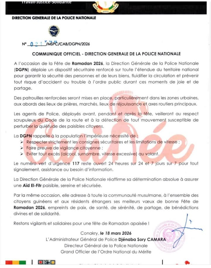 À l’occasion de l’Aïd El-Fitr, qui marque la fin du mois de Ramadan, la Direction nationale de la Police informe du renforcement de son dispositif de sécurité sur l’ensemble du territoire.